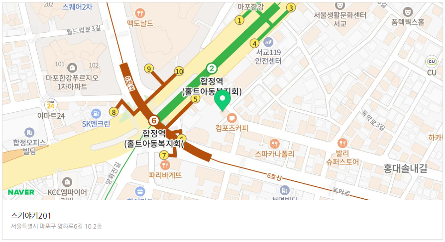 주차 공간 별도로 없음 / 연이 민영주차장 또는 합정 노상 공영주차장 이용