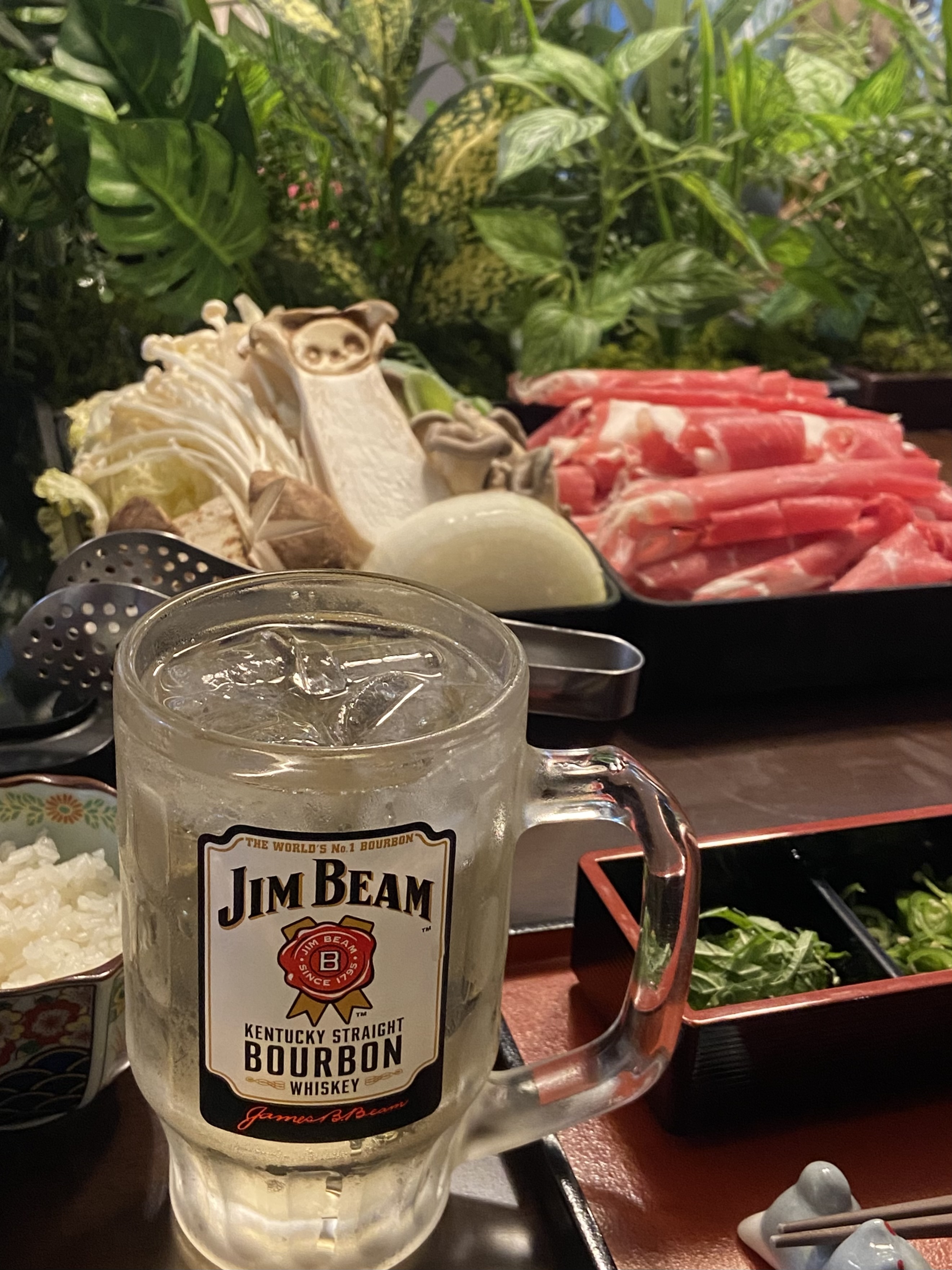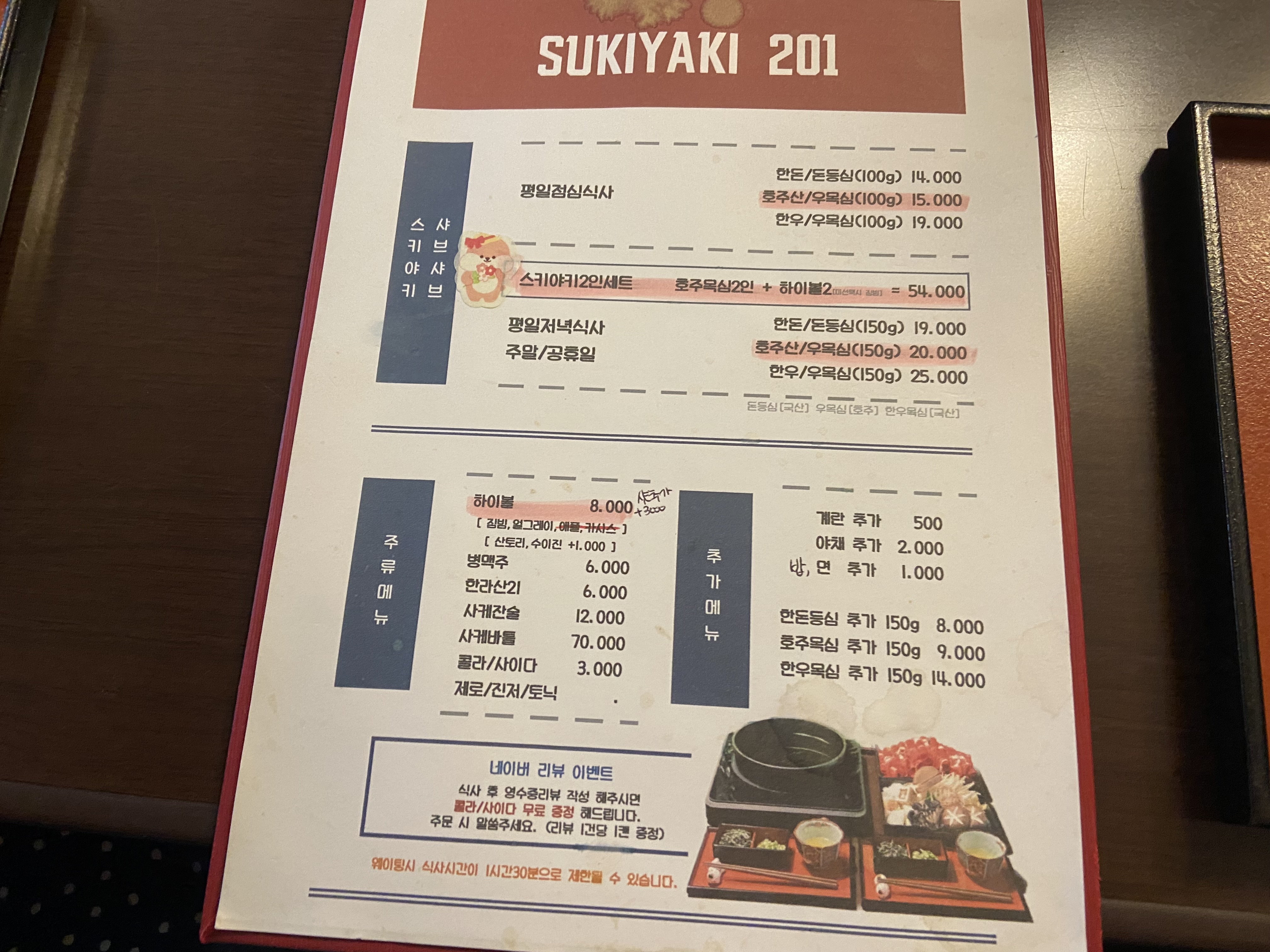 저는 하이볼도 한잔하고 싶어서 스키야키2인세트로 주문하였어요.