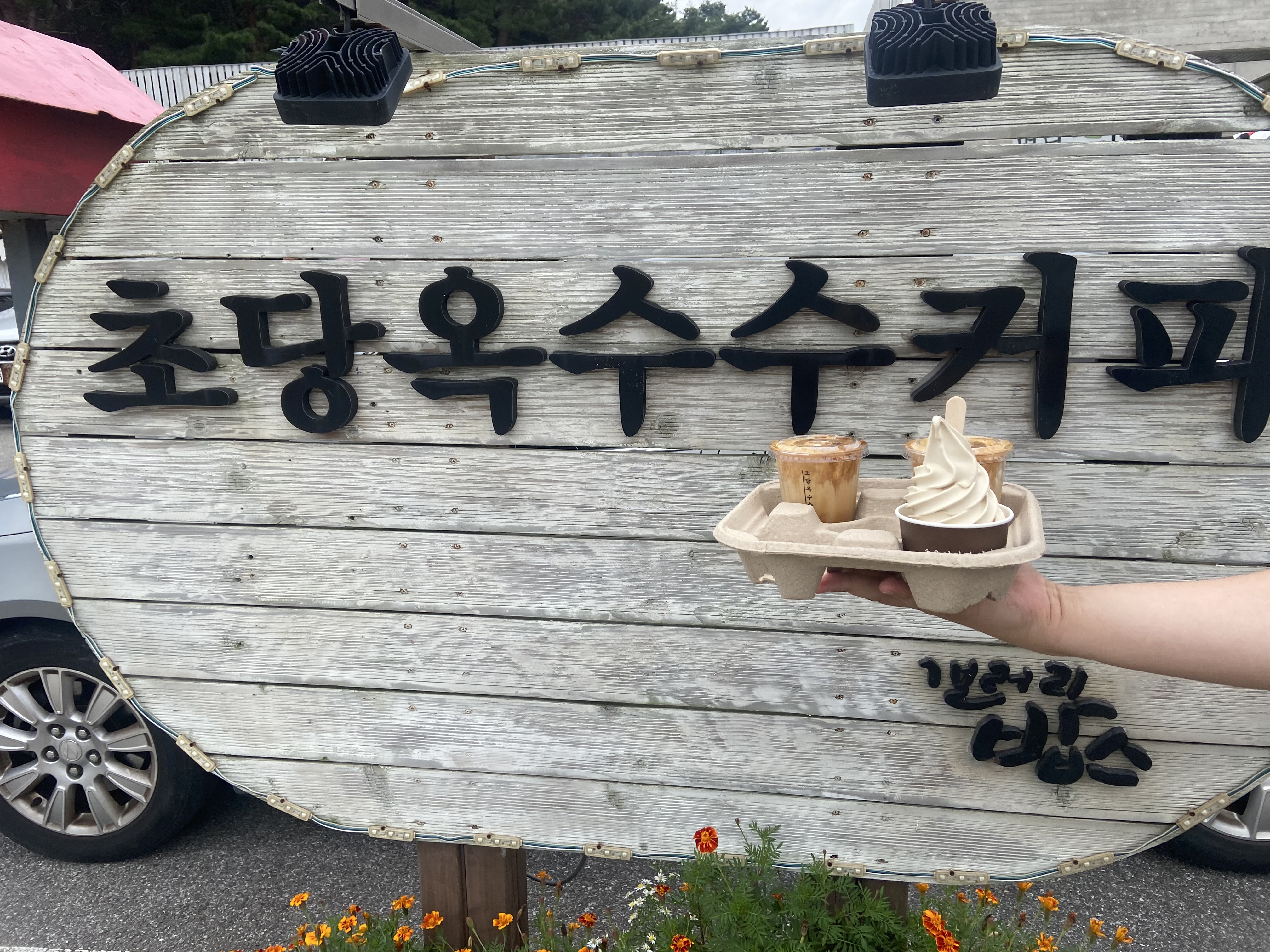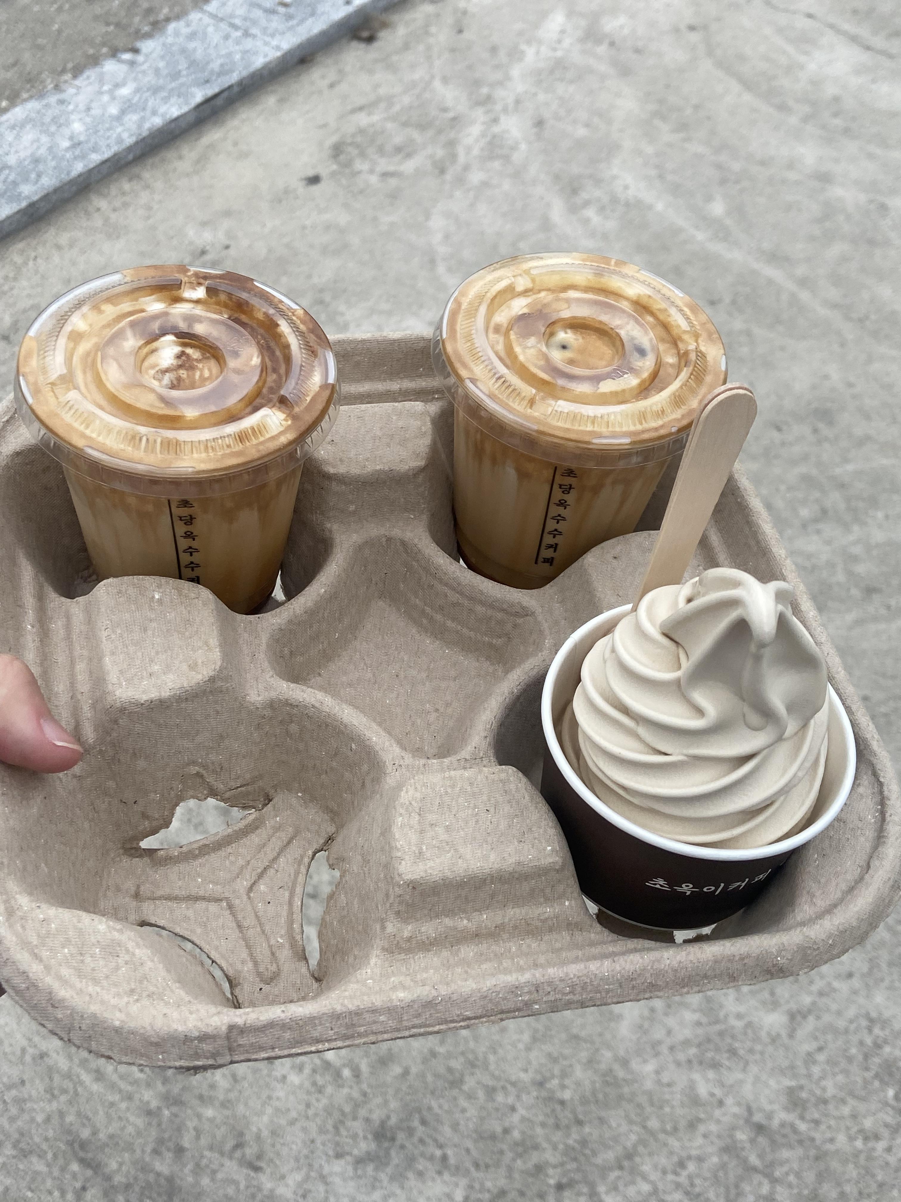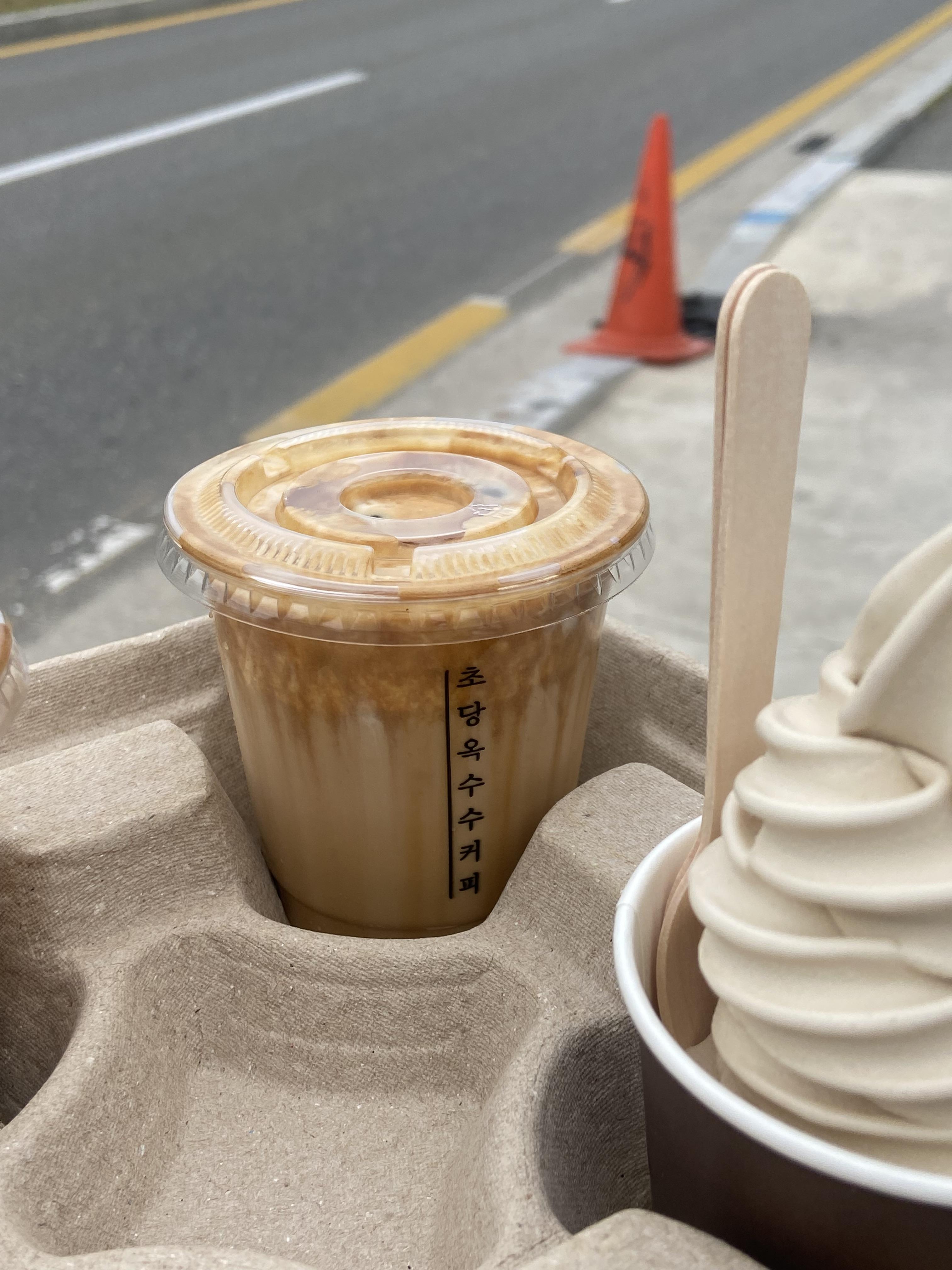 초당 옥수수 커피도 맛있지만 초옥이 커피 아이스크림도 맛나다고 해서 커피 2잔, 아이스크림 한 개를 주문했어요!