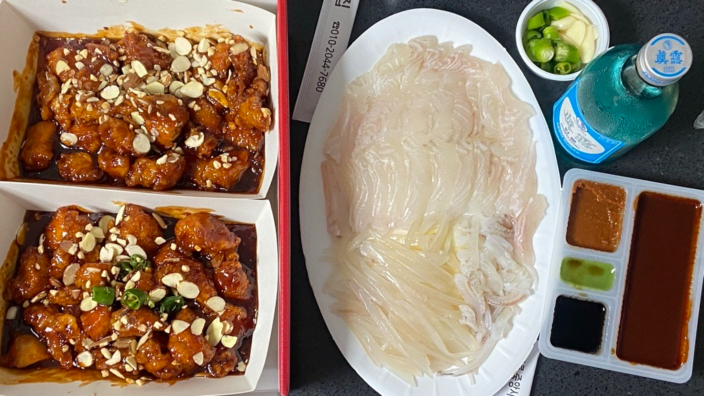 배니 닭강정과 회에 소주 한잔!