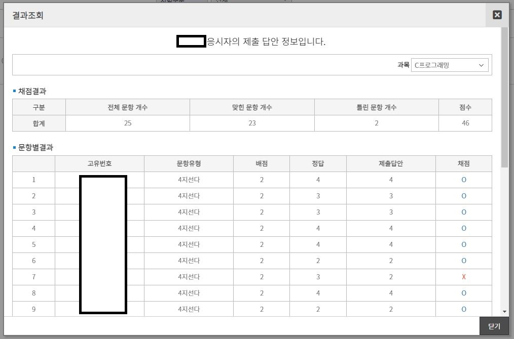 오른쪽에 과목을 클릭하면 시험 본 과목들이 나오고 각각의 결과를 볼 수 있다.